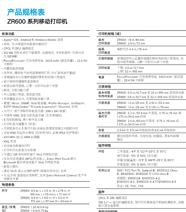 ZEBRA 斑馬藍(lán)牙便攜打印機(jī) 無線條碼標(biāo)簽打印機(jī) ZR658 藍(lán)牙WIFI版 (48mm寬)